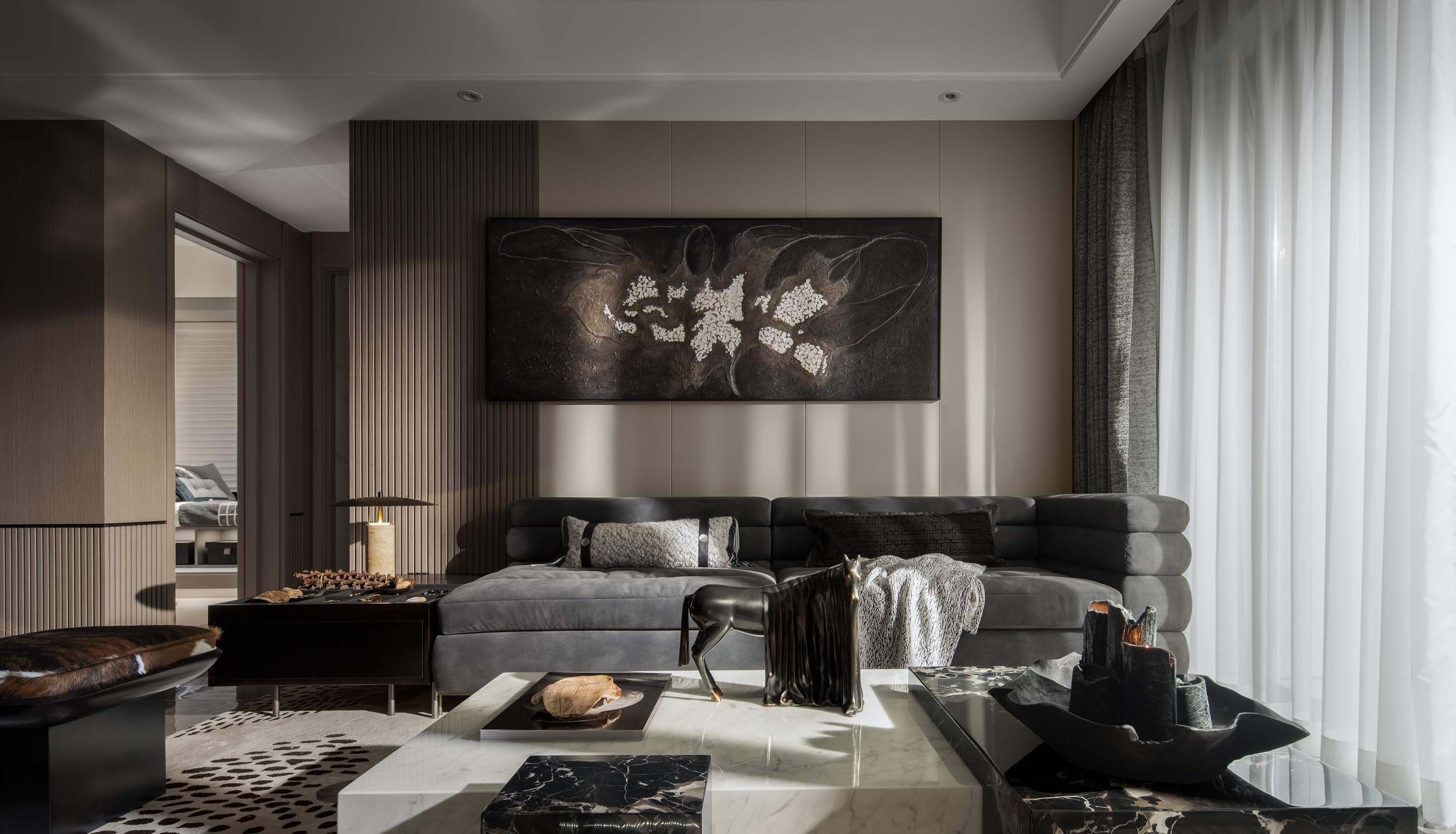 Longhu Fanke Tianfeng, a model room of 142 ㎡ super high-rise experience area with the elegant atmosphere of Eastern culture and modern art, is located in Guangzhou. The designer uses modern artistic techniques to interpret and reconstruct traditional Oriental elegance, constructing the entire spatial order with unbounded fields, expanded perspectives, and elegant scales, and meticulously constructing a humanistic and elegant artistic realm.