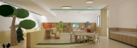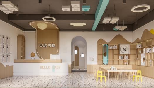 The cashier in the lobby provides collection and storage, the bookshelf provides picture books and LEGO placement, and the LEGO table next to it can provide reading, LEGO collage, reception, and parents can also interact with their children here to experience reading picture books and assembling LEGO. This also achieves commercial purposes, adding blue and yellow colors to liven up the entire space. The children's painting and sketch classrooms have a ground beam.