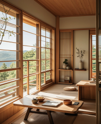 This residential villa, with its unique log style design, perfectly blends natural and modern living concepts. The interior space is open and bright, with every detail revealing warmth and comfort. The living room, as the core area of the home, introduces natural light through the large windows, which contrasts with the green trees and mountains outside the windows, as if introducing the natural scenery directly into the home.