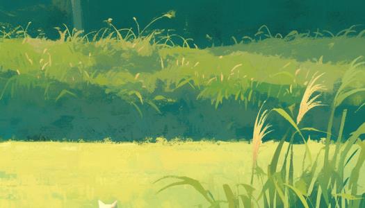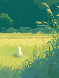 The graphic design illustration with the theme of “The Green Journey of a Free Spirit” shows a white kitten unrestrained in the vast nature. In the picture, the kitten sits leisurely on the soft grass, with its back to us, as if enjoying the embrace and freedom of nature. It is surrounded by reeds swaying in the wind and vibrant grass, while in the distance there is a lush forest, all enveloped in a soft green glow. The kitten's figure reveals curiosity and longing for the unknown world.