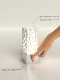 This is a new ceramic luminaire, the design is inspired by the natural structure of Taihu stone. The top ceramic lampshade was designed by using Tyson polygon to simulate Taihu stone, and the ceramic light curing 3D printing was used. The use of ceramic material and the structure of the lampshade makes the lampshade have a soft light effect. At the same time, in use, the light, lampshade, and ceramic material also form an interesting installation art. We use the magnetic connection to connect the lampshade to the base and touch sensitive interaction to avoid damaging the integrity of the lamp.