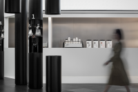 The space design takes "Pillar-Matrix" as the core idea. The "Pillar-Matrix" comes from the brand story related to chess - S.O.E (Square Of Eight) is named after chess, representing the 64 black and white squares on the chess board. The space consists of three main areas interspersed with black and white boxes. The black boxes refer to the array form in the chessboard, and 14 black pillars are erected, in which 8 intelligent thermos pots are scattered and hidden, and through the corresponding liquid dispensing faucet on each root.