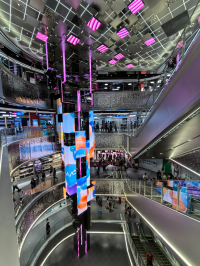 The project is located in Guangzhou City, China, Haizhu District, Industrial Avenue North, No. 110, Guangzhou Jingdong MALL shopping mall, which is a very creative intelligent lifting LED screen, consists of 11 pieces of up and down movement of the LED screen composition, 11 screens, which also includes 4 pieces of 90 ° corner of the LED screen, the screen's movement of the track for the 12m up and down range of movement, can be independently controlled by each movement of the LED screen units. The movement of the screen track is 12m up and down.