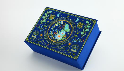 This jewelry box not only retains the warmth of handmade art, but also adds a sense of technology and modernity. The highly textured traditional hand-embroidery technique engraves elements such as flowers, butterflies and plants that symbolize the beauty and harmony of nature on the surface of the fabric, showing a convex and concave retro touch. Using self-luminous thread as pattern embroidery thread can further enhance the highlights of the product. This kind of thread can switch the light flashing frequency allowing graphic design to leap into the light and shadow space.